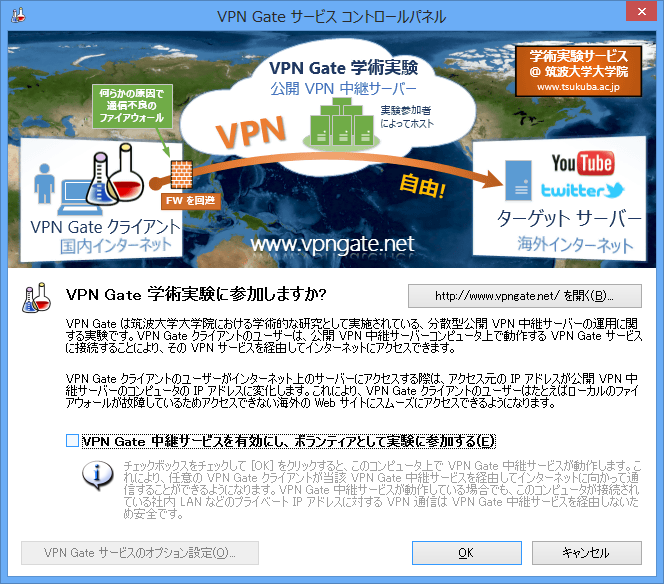 上記の「VPN Gate 中継サービスを有効にし、ボランティアとして実験に参加する」(デフォルトで